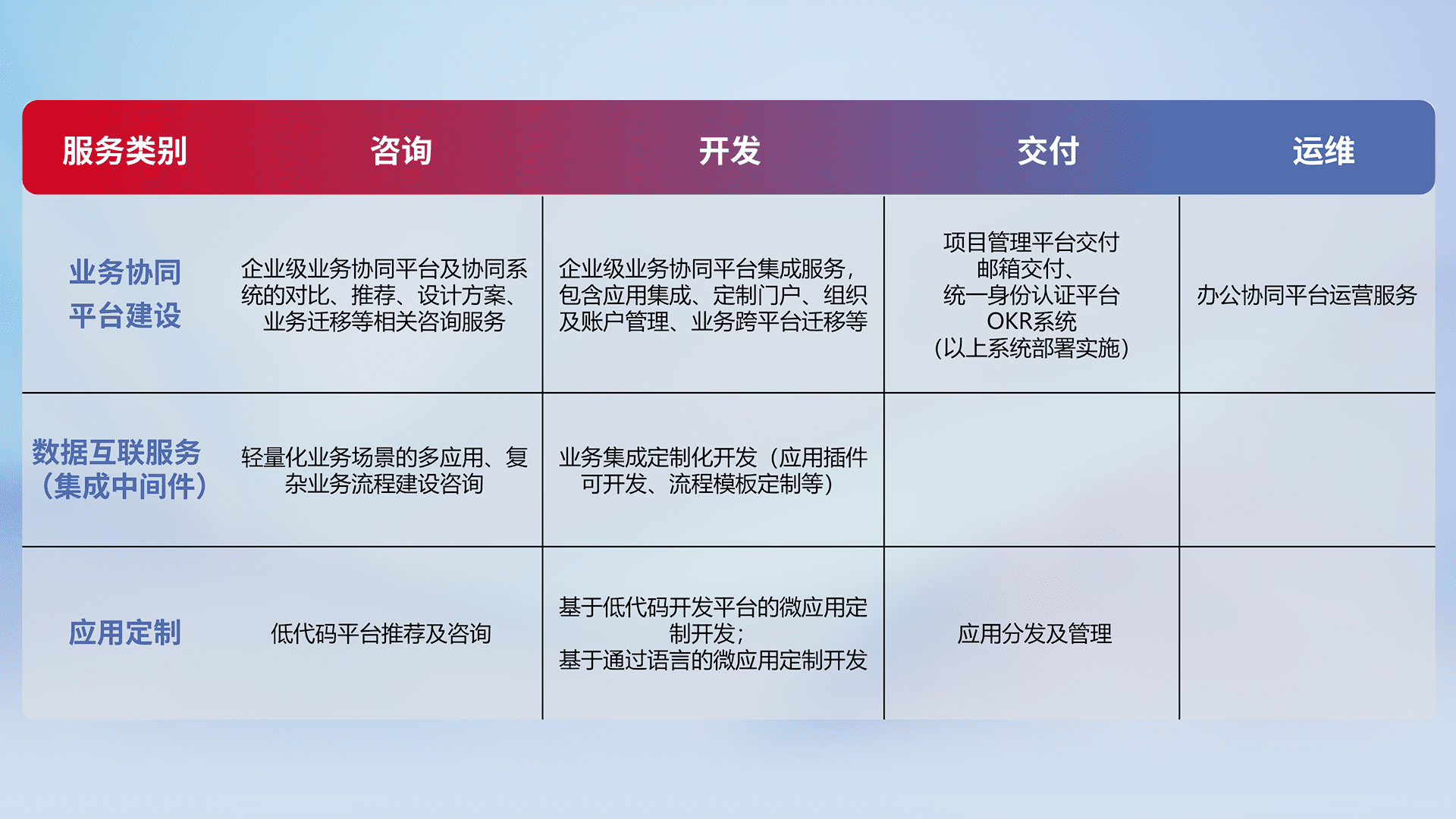 针对钉钉、、、企微、、IDaas等平台级产品提供产品的规划、、、、方案、、、交付、、定制化开发等服务,,,实现如统一协同办公、、、、智能客户服务、、混合会议管理、、、、智能数据查询、、、、等业务场景,,,,实现数字化转型。。。
